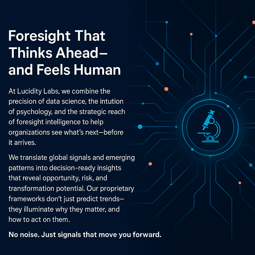 At Luciditylabs.ai™, we combine the precision data with the science of, psychology, and the strategic reach of foresight intelligence to help organizations, leaders, and entrepreneurs see what’s next — before it arrives.