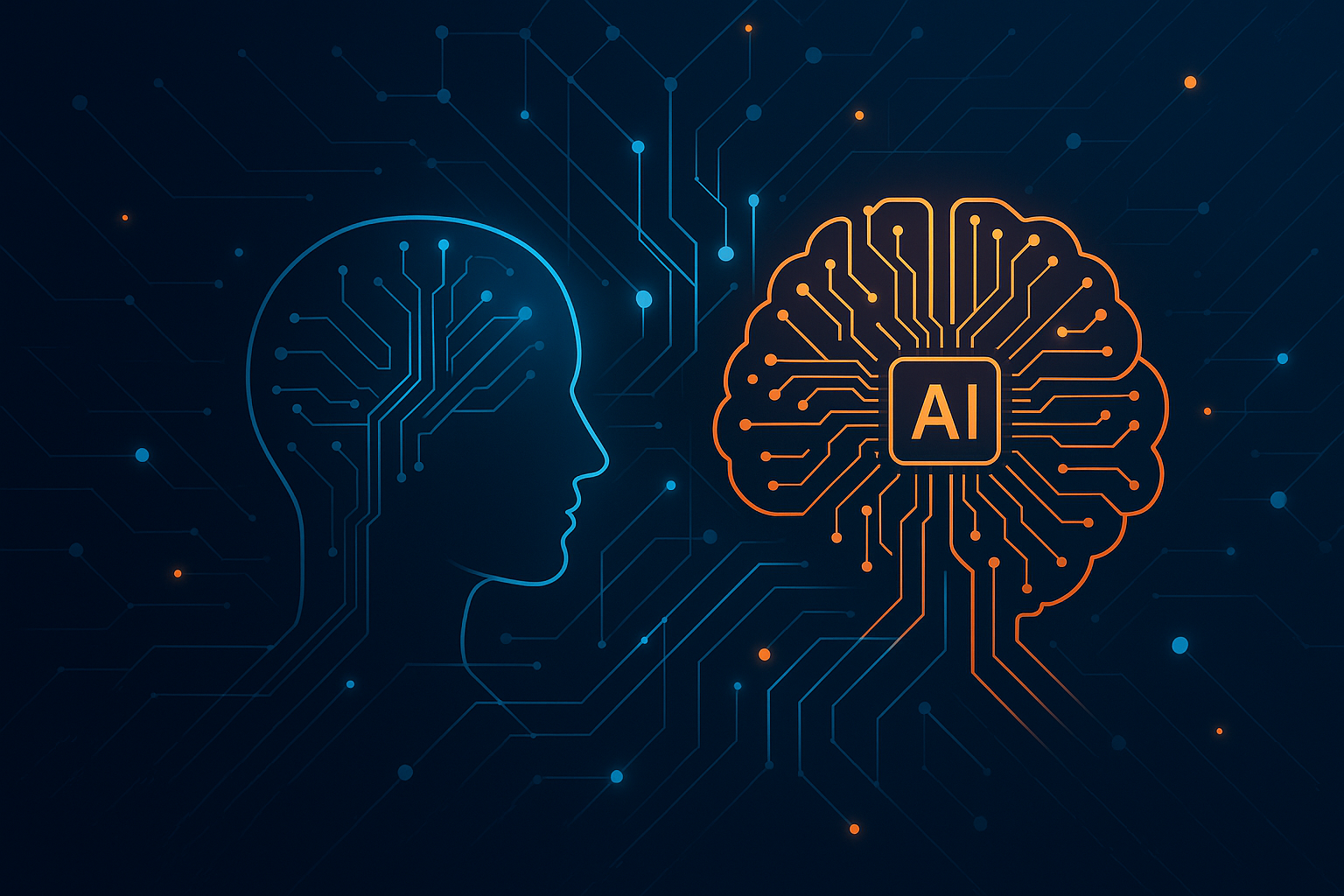 Digital illustration of a human head and a brain connected to artificial intelligence with circuitry and AI label.